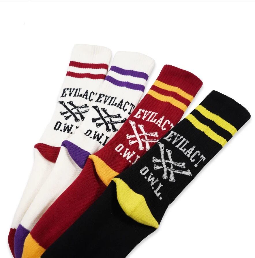 DOUBLE CROSS BONEのロゴと2本のラインをマルチカラーで表現したデザインのロングソックス