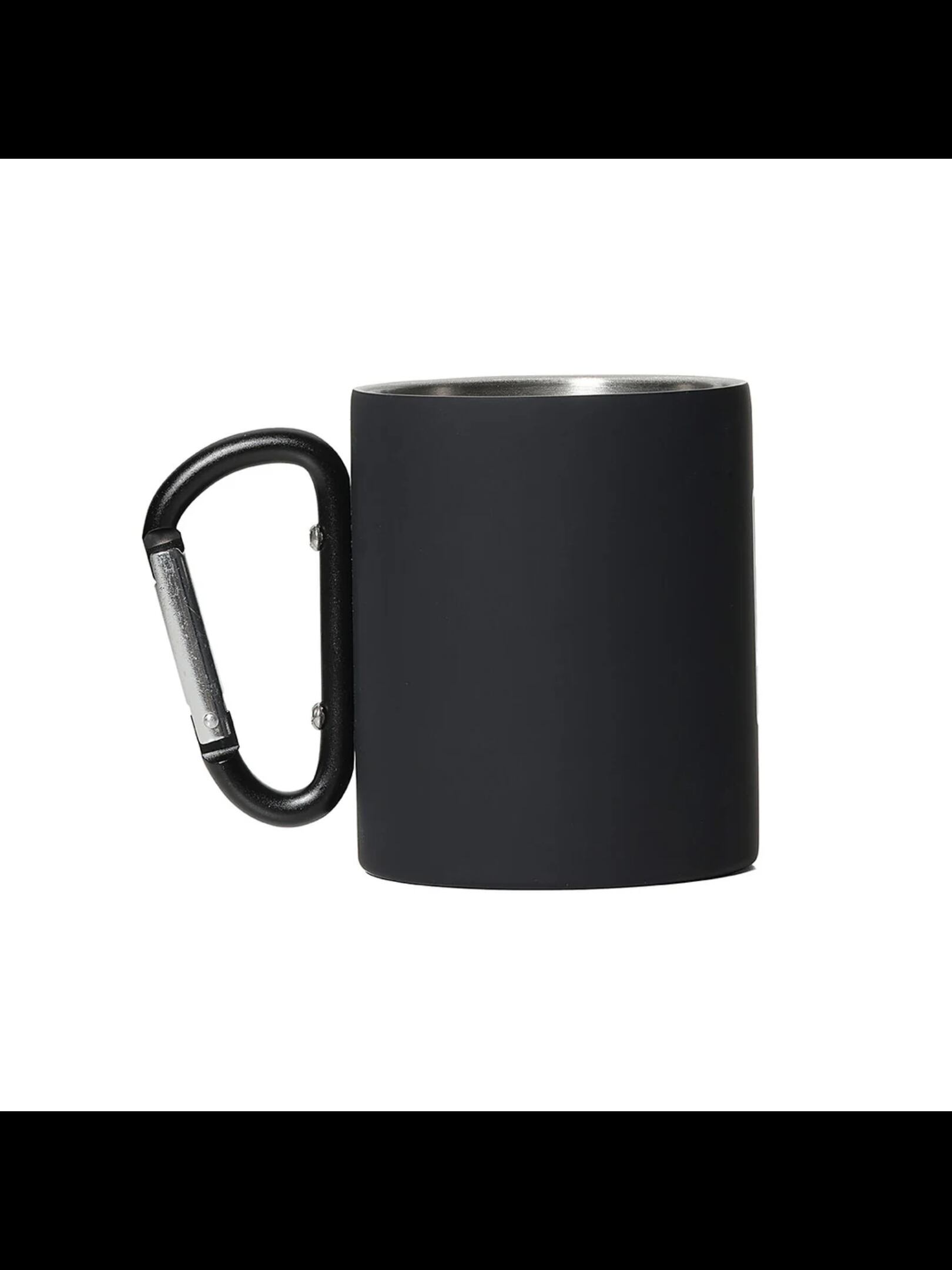 マット樹脂加工のプリントを施した、カラビナ付きマグカップ。持ち手がカラビナになっているため、バッグに付けるなど携帯性も抜群。