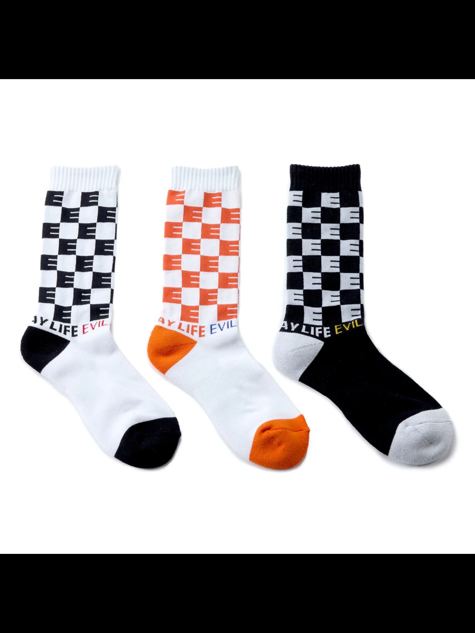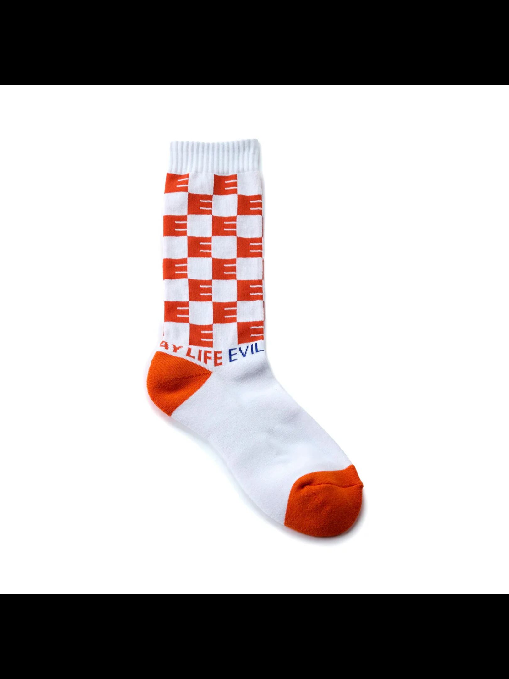 EVILACT の頭文字「E」を用いたチェッカー柄のSOCKS。