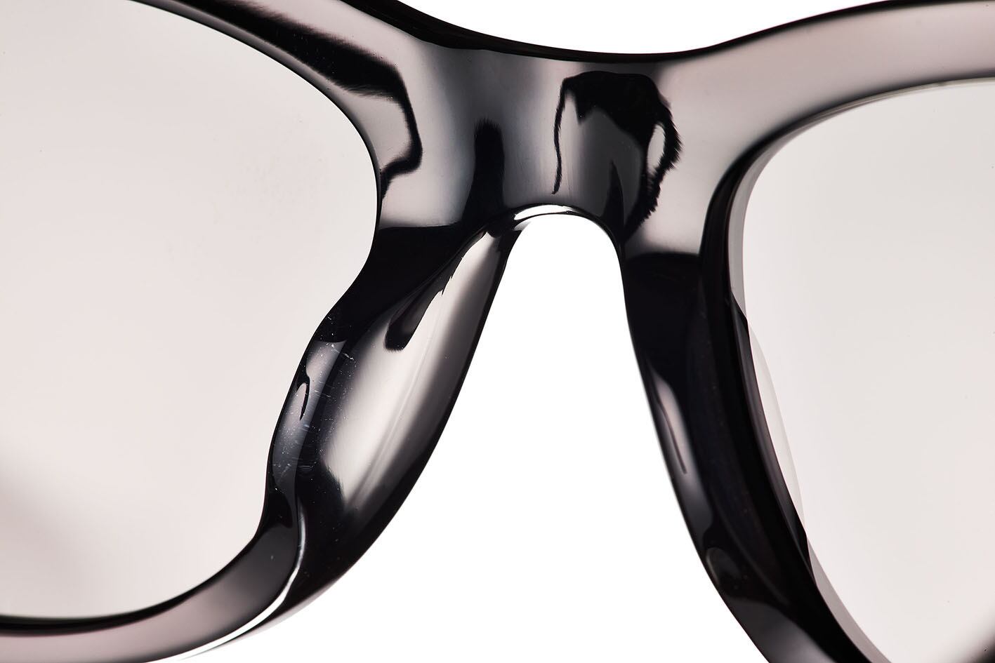 ブロー部とブリッジに3Dカットを施し、テンプルにEVILACTのエンブレムが埋め込まれた"フランダース"。