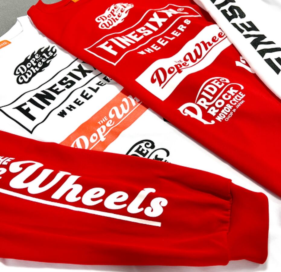 アパレル部門からファインシックス・ブランドディレクターがアパレル開発に関わるクリエイティブディレクションを監修したDOPE THE WHEELS(ドープウィールズ)協賛3社とのトリプルコラボネームアイテム。フロントには協賛チームのイベントロゴがレイアウトされ、袖にも贅沢にグラフィックがはいります。さらに背面には3社のロゴもドロップされたトリプルネーム仕様となっています。
