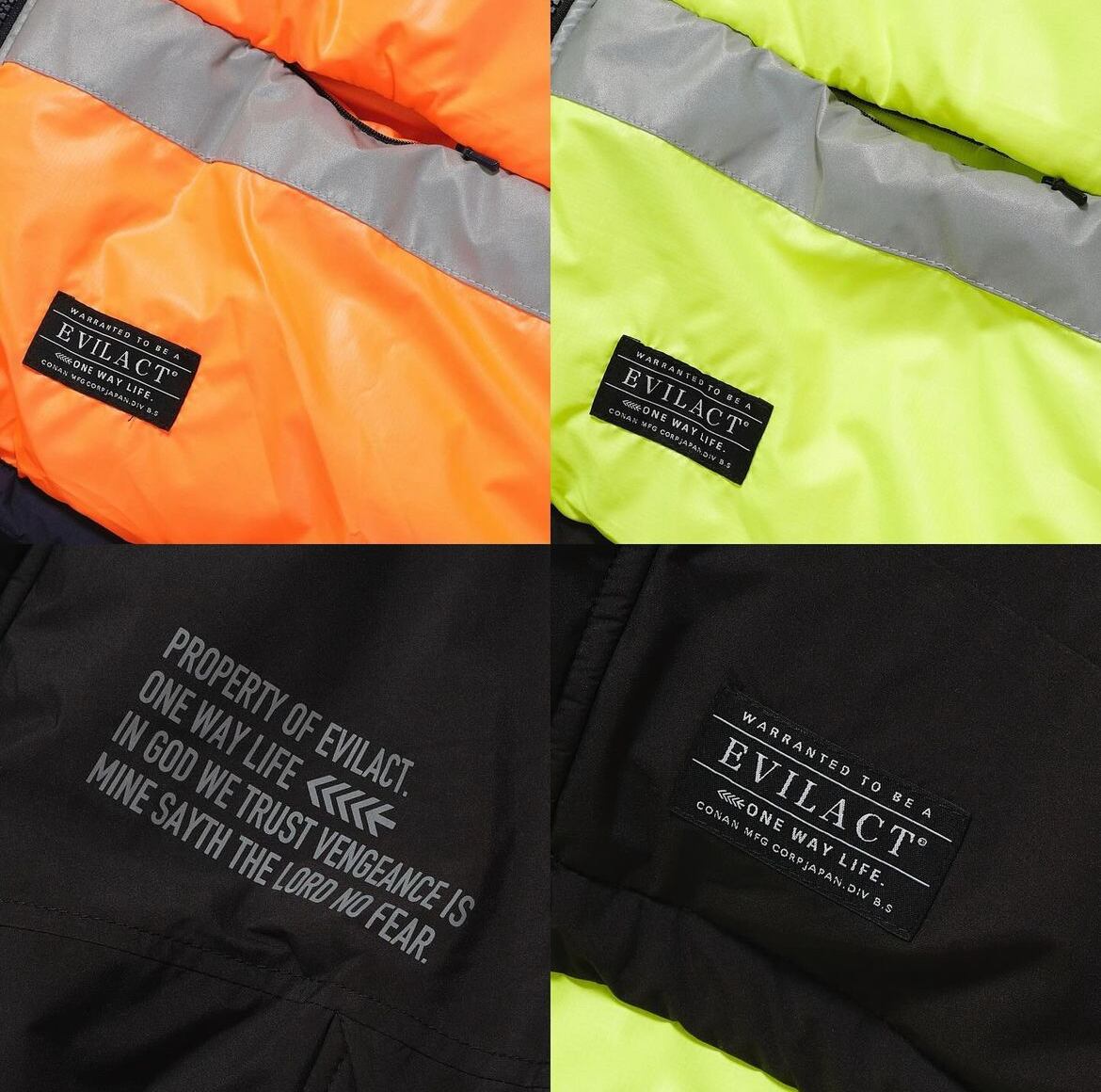 リバーシブルデザインで、表面は単一カラーで大容量ポケットを配置し、シンプルにまとめ上げられ、裏面にするとリフレクトテープを使用した発色の良いSECURITY COLORのJKTに変身するという、秀逸なデザインに仕上げているのが特徴です。